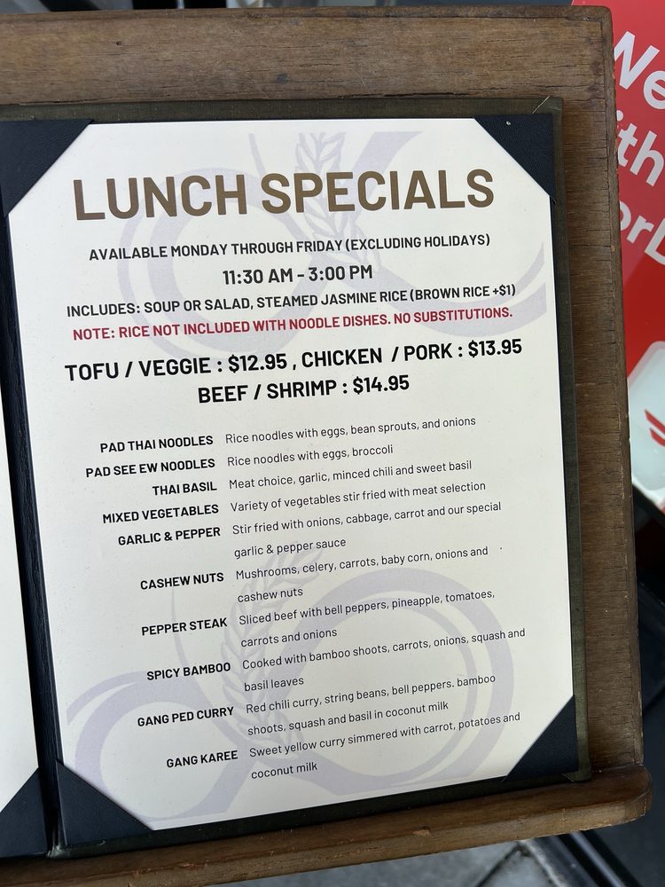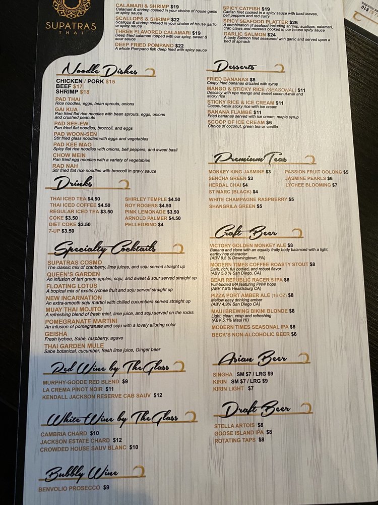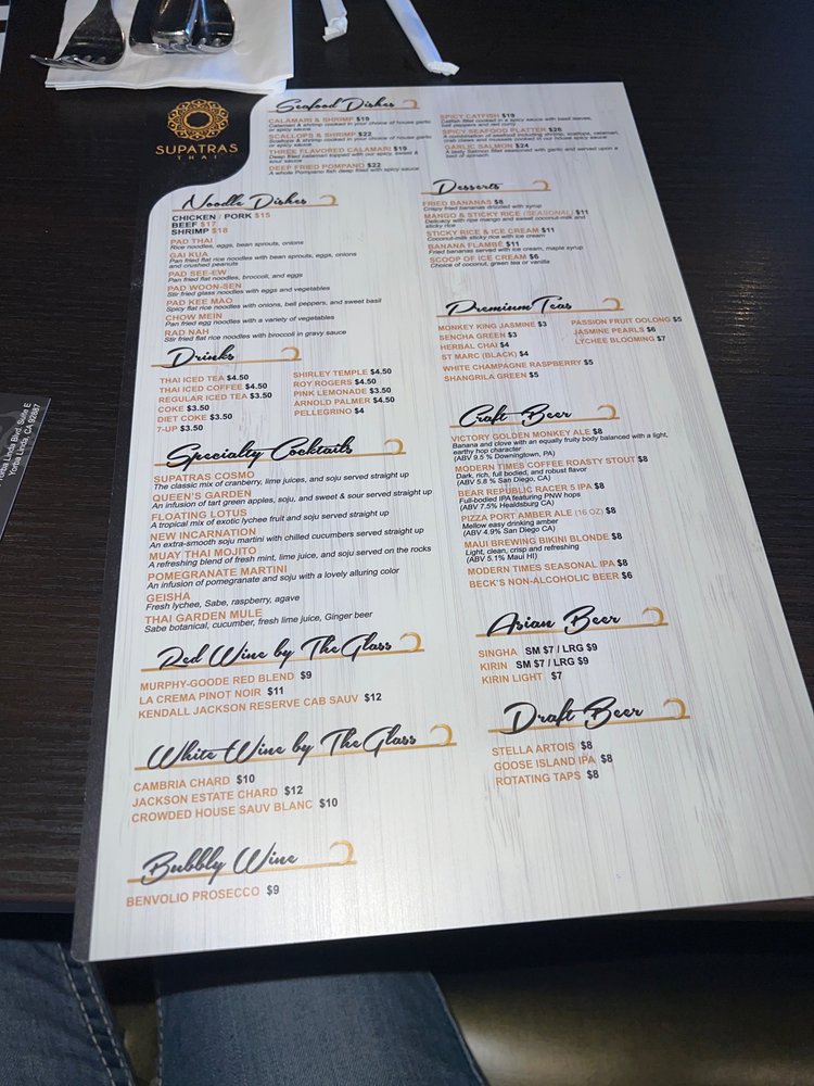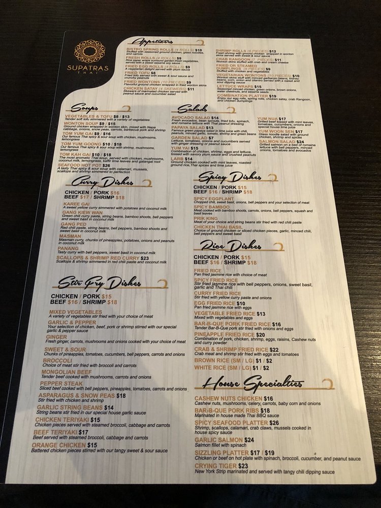 Introducing the menu at Supatras Thai Bistro, a beloved dining spot in Yorba Linda, CA. This restaurant offers a variety of Thai dishes with options for vegans and vegetarians. Known for its amazing flavors and balance, customers rave about the delightful papaya salad, prik king, drunken noodles, Tom kha gai soup, spicy fried rice, eggplant tofu, and Thai iced tea. The Gang Ped curry and Pineapple Fried Rice are highly recommended for those craving authentic and flavorful dishes. The staff provides friendly and fast service, creating a welcoming atmosphere for all visitors. The restaurant is also praised for its cleanliness, easy ordering process, and ample parking. Stop by Supatras Thai Bistro for a delicious dining experience that will leave you coming back for more.